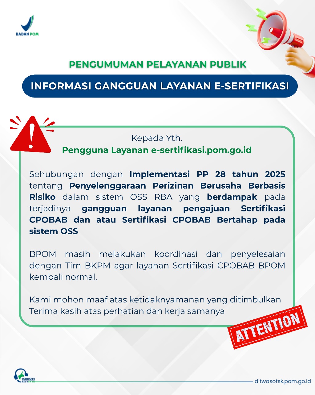 Informasi Gangguan Layanan Sertifikasi CPOBAB dan CPOBAB Bertahap dikarenakan adanya konfigurasi terhadap implementasi PP 28 tahun 2025