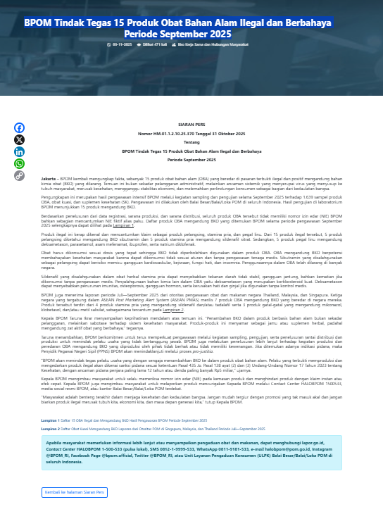 BPOM Tindak Tegas 15 Produk Obat Bahan Alam Ilegal dan Berbahaya Periode September 2025 <<Link https://www.pom.go.id/siaran-pers/bpom-tindak-tegas-15-produk-obat-bahan-alam-ilegal-dan-berbahaya-periode-september-2025>>