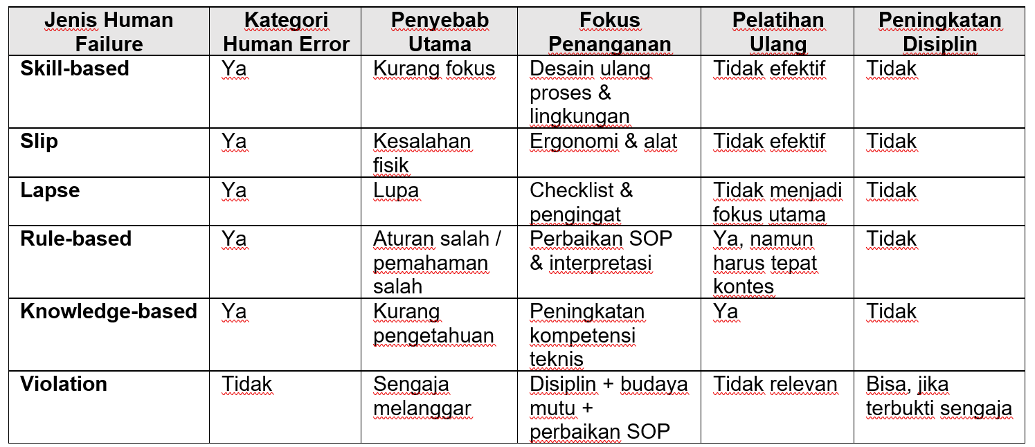 Ketika human error terlalu sering disebut sebagai penyebab, itu menjadi tanda bahwa investigasi tidak dilakukan secara mendalam. Banyak masalah yang tampak seperti akibat human error, terutama jika terjadi berulang, yang sebenarnya berasal dari kelemahan pada proses atau sistem. Kalau proses dan sistemnya tidak diperbaiki, masalah akan terus muncul meskipun kesalahan selalu dikatakan sebagai human error.