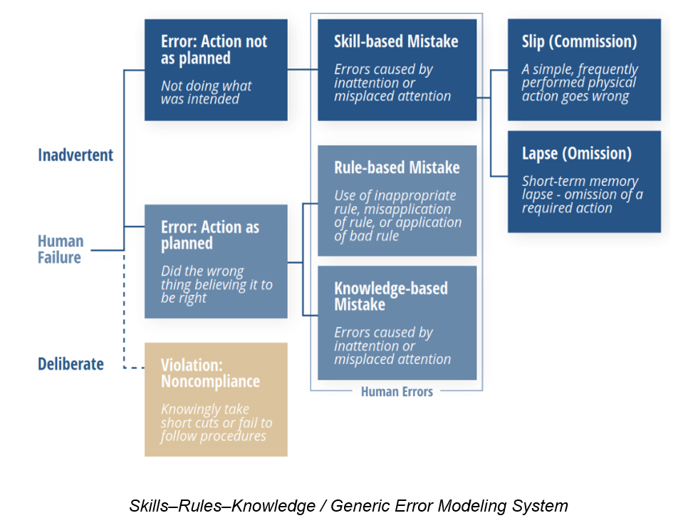 Salah satu model yang sering digunakan adalah Skills–Rules–Knowledge / Generic Error Modeling System. Model ini sederhana namun efektif untuk memisahkan mana yang benar-benar human error dan mana yang sebenarnya dipicu oleh masalah sistem.